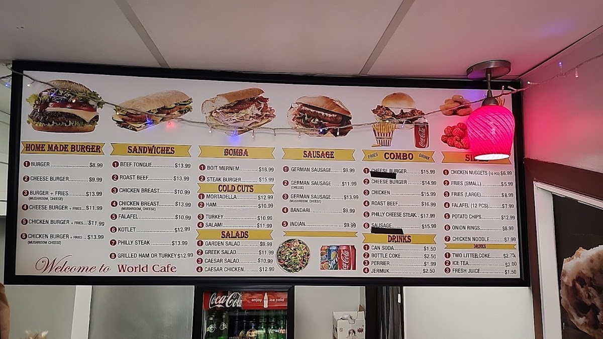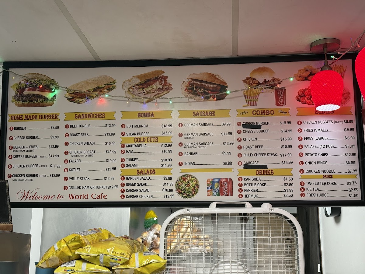 The menu at World Cafe is organized into several distinct categories, offering a variety of food and drink options suitable for casual dining or quick meals. Visitors can find selections ranging from beverages to hearty sandwiches and salads.